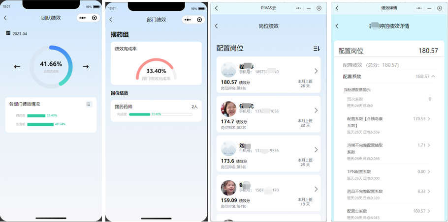 PIVAS云·绩效管理系统是基于上百家医院管理实践数据,构建的专业场景绩效管理库,覆盖五大岗位,针对不同岗位场景考核维度管理。实现调配差错溯源,对相关环节责任定位;人力成本降低智能排班优化人员复用率;绩效纠纷下降,数据透明度大大提升。